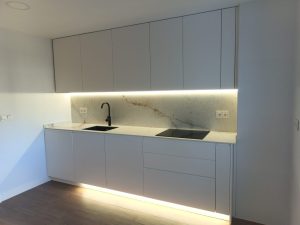 REFORMA INTEGRAL DE COCINA. AZULEJO RECTIFICADO BLANCO MATE DE GRAN FORMARO. PAVIMENTO PORCELANICO IMITACION A [...]